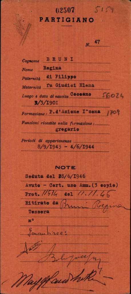 Tranne Regina Bruni, madre del martire Francesco Bruni, trucidato dalle S.S. a Roma, di cui negli anni scorsi già Angelino Loffredi ne aveva tracciato le vicende storiche, delle restanti donne non si hanno tracce o notizie, mentre a mio avviso questo è uno degli aspetti più interessanti da ricostruire: le donne ebbero un ruolo attivo e non marginale nella resistenza all’oppressore anche nel Lazio e non soltanto nel Nord Italia.